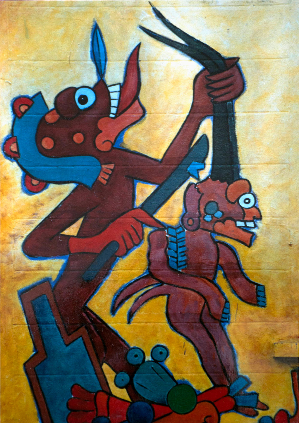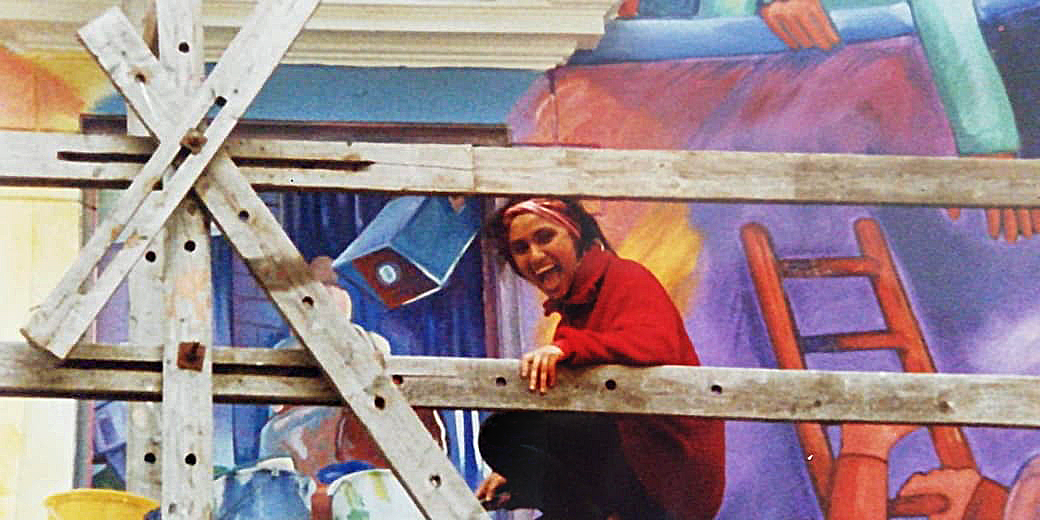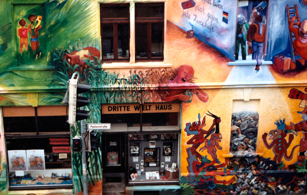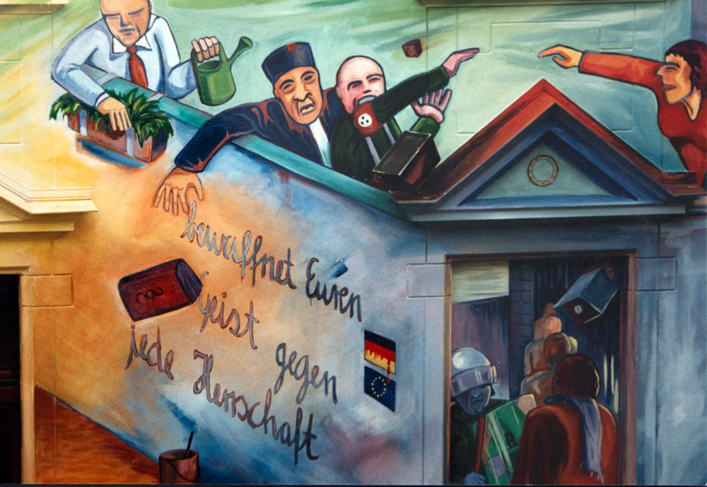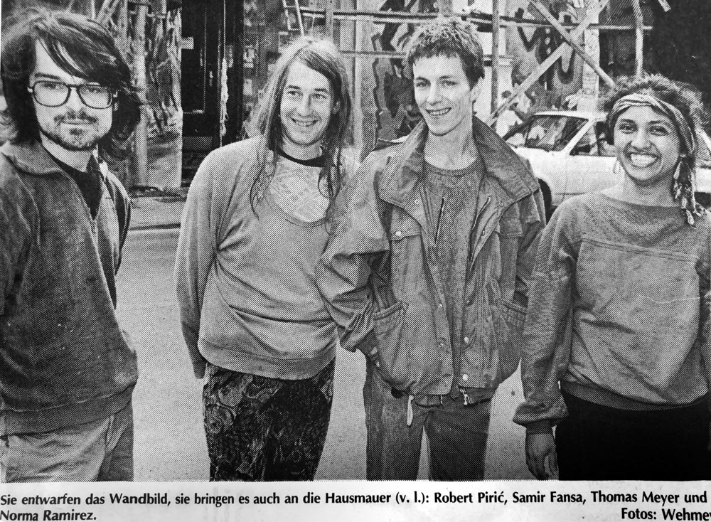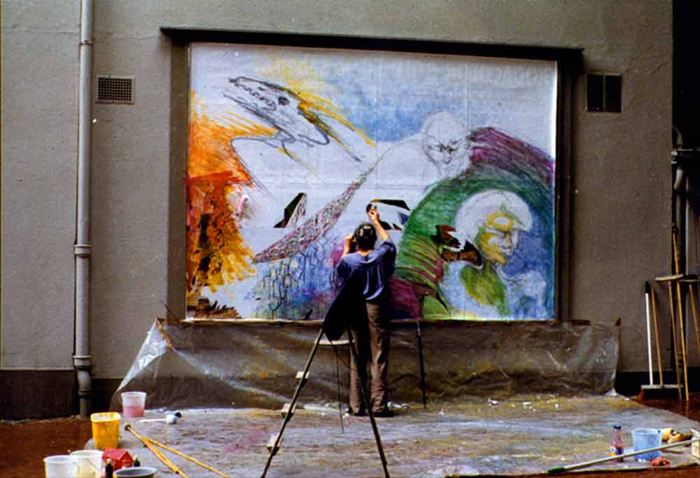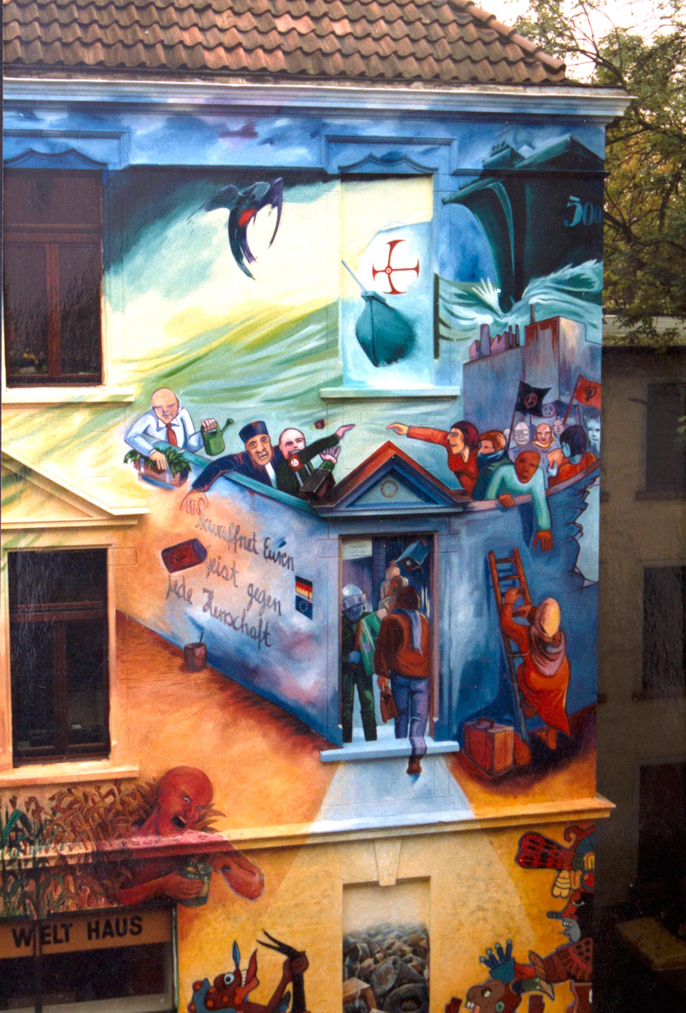 2. Mural efímero realizado en 1989 con apoyo de Joachim Nietzsche dentro de la acción denominada “Aktion Kunstplakate”, que consistió en quitar los anuncios comerciales del centro histórico de Göttingen, Alemania y sustituirlos por obra de los artistas residentes en esta ciudad. Fue organizado por la galería Apex y realizado en los patios de la Iglesia de Jacobo (Jacobskirche).