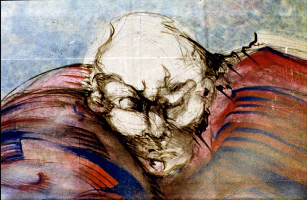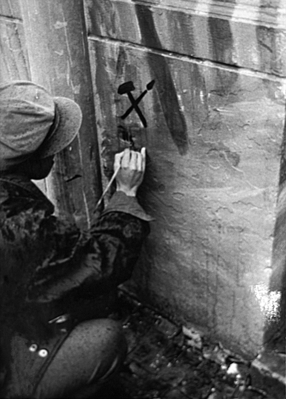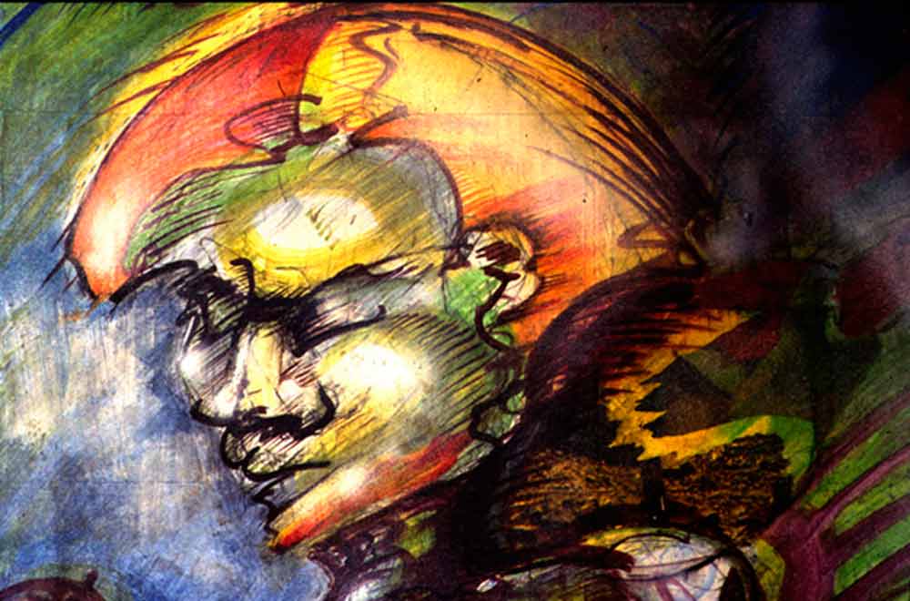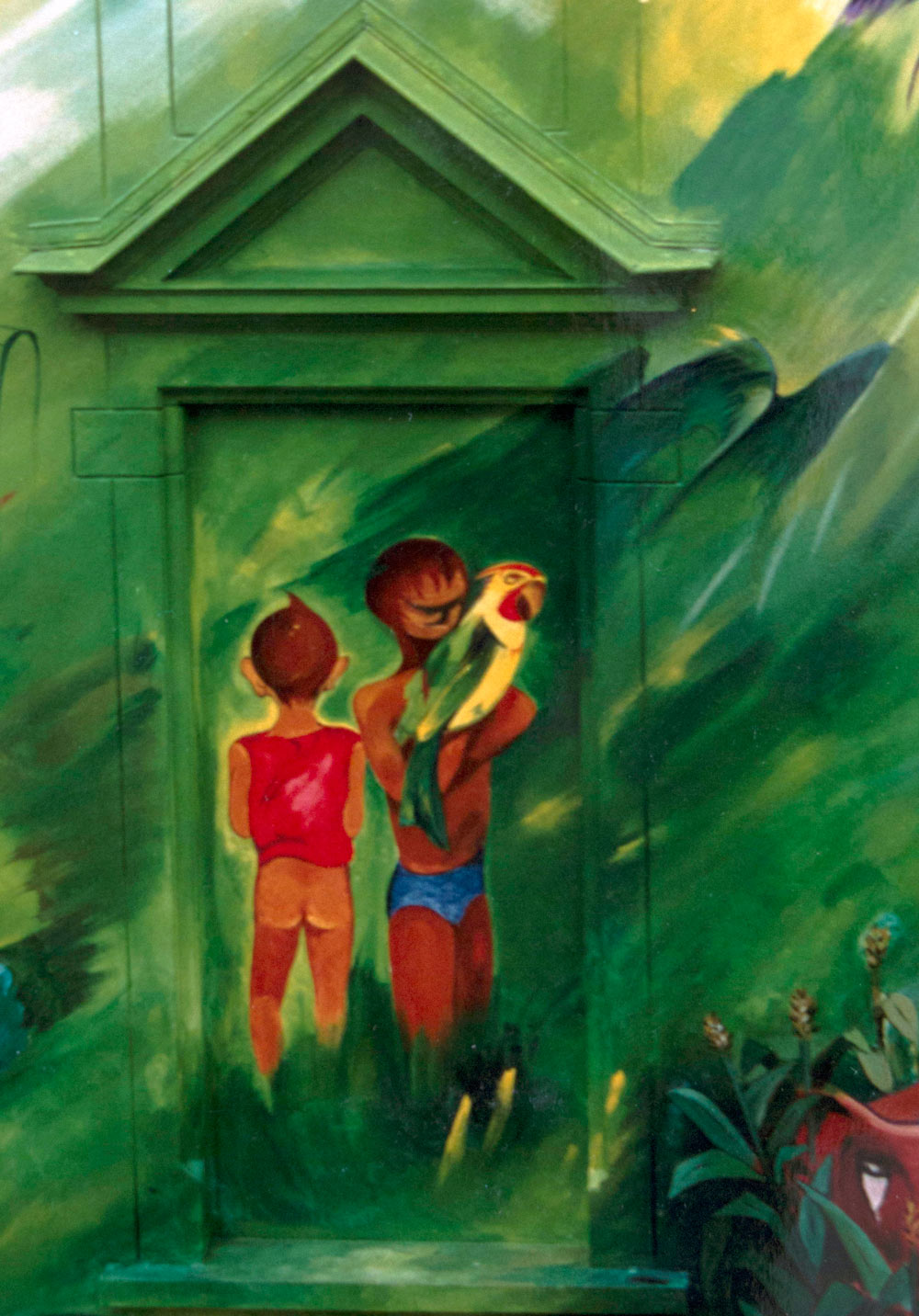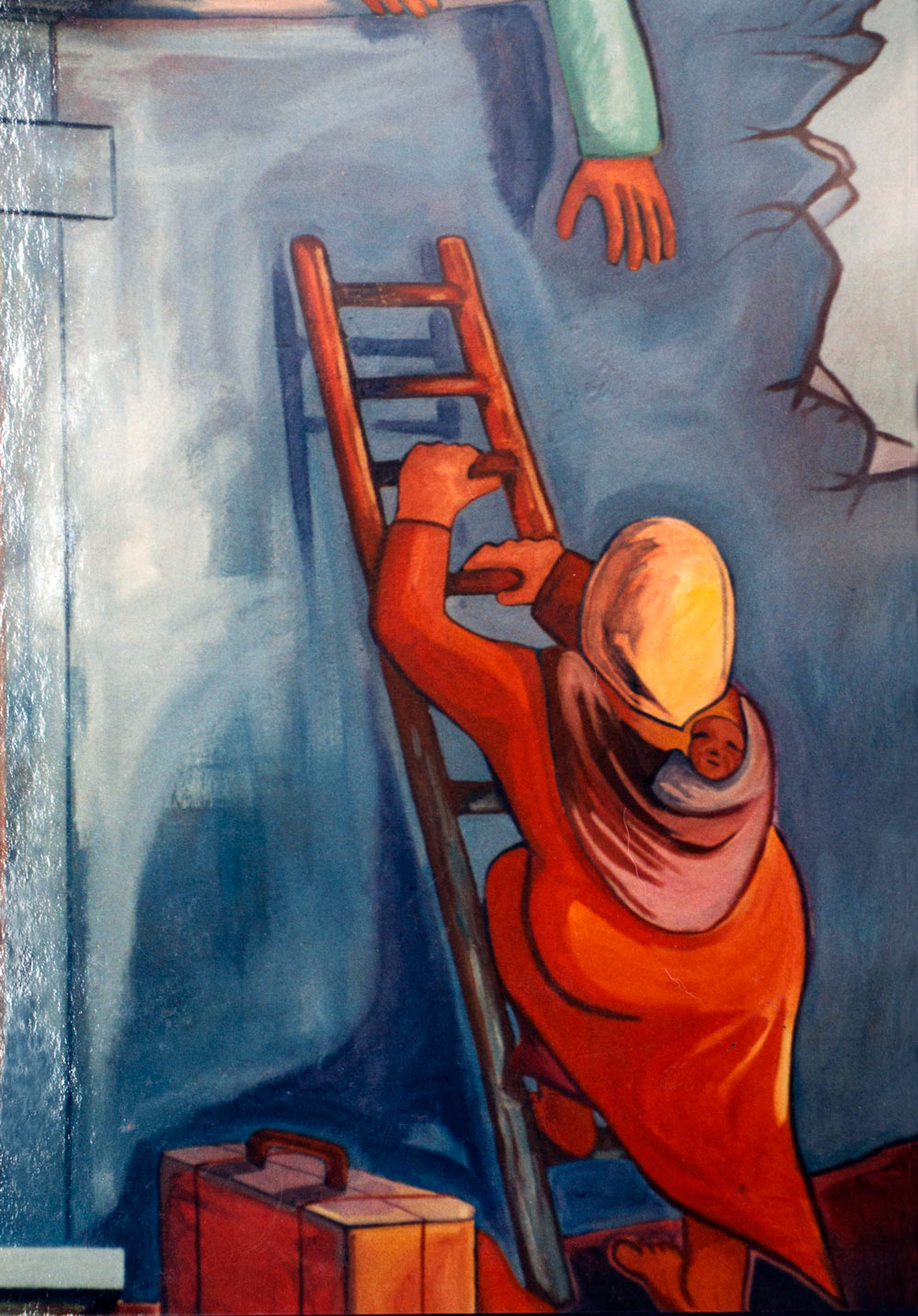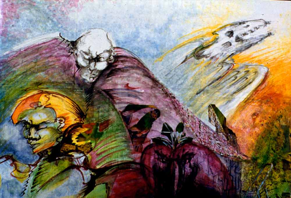 2. Mural efímero realizado en 1989 con apoyo de Joachim Nietzsche dentro de la acción denominada “Aktion Kunstplakate”, que consistió en quitar los anuncios comerciales del centro histórico de Göttingen, Alemania y sustituirlos por obra de los artistas residentes en esta ciudad. Fue organizado por la galería Apex y realizado en los patios de la Iglesia de Jacobo (Jacobskirche).