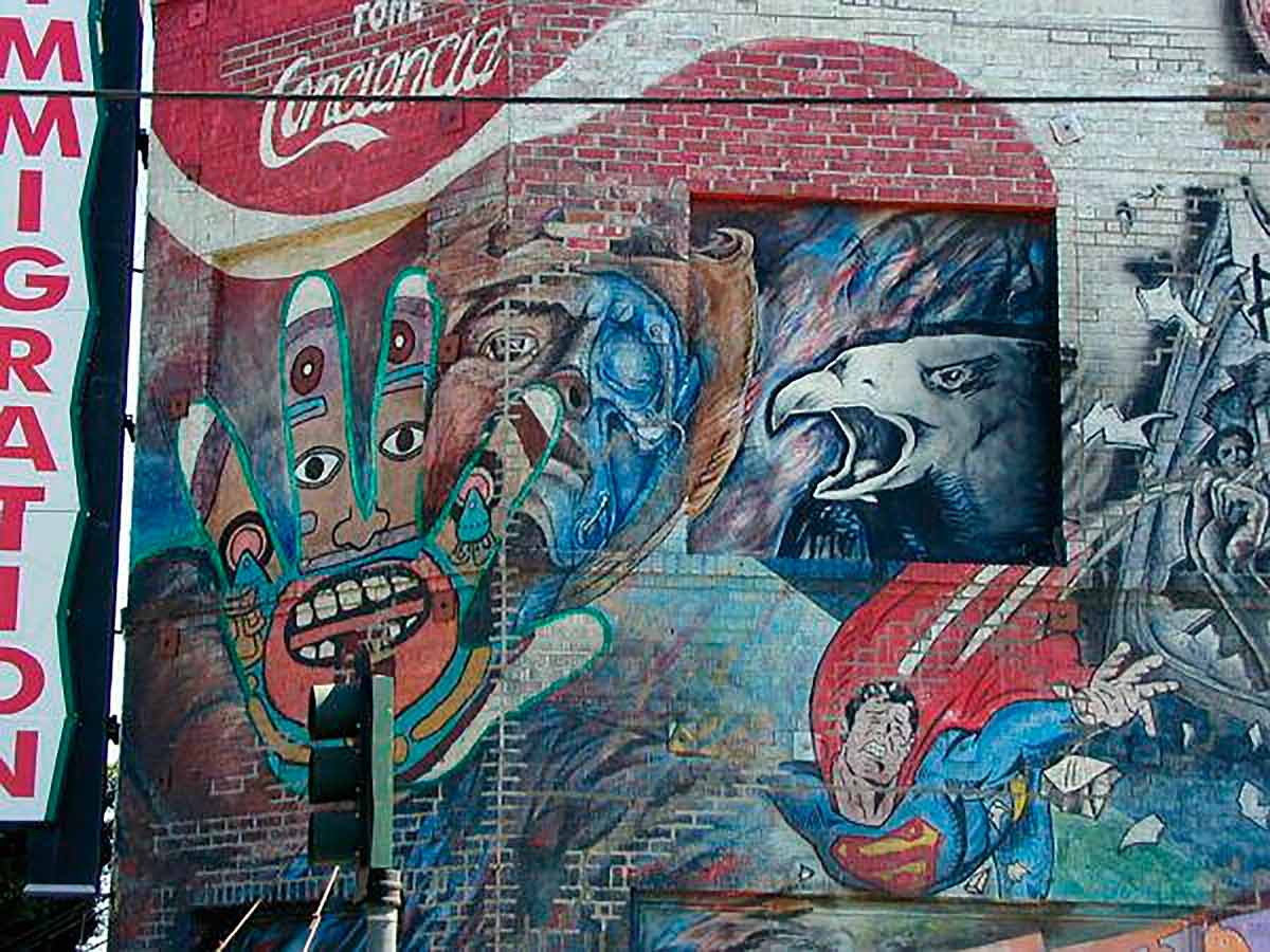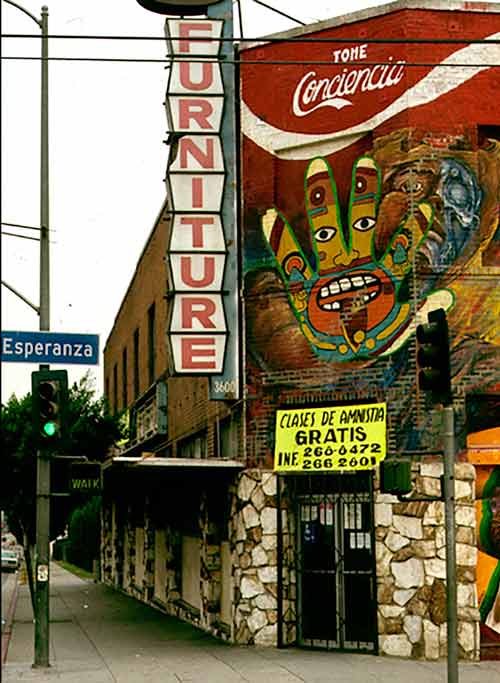 1.Mural de los Ángeles, California en 1987. Este mural ya desaparecido fue realizado en la esquina entre las calles Withier y Esperanza con el tema de los trabajadores indocumentados en coordinación con un centro de inmigrantes que laboraba en este edificio. Se realizó con los recursos de la UAM-Xochimilco del área de Tecnología y Producción y varios profesores que laboraban en ese momento en la Universidad.