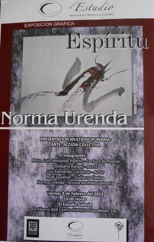 “Espíritu” es el nombre de esta exposición con performance realizada en la galería “Estudio” en la ciudad de Zacatecas, Zacatecas. Este evento fue registrado por el fotógrafo Dante. Suyas son las imágenes que se muestran del performance, cuyo tema fueron los diferentes matices del amor.